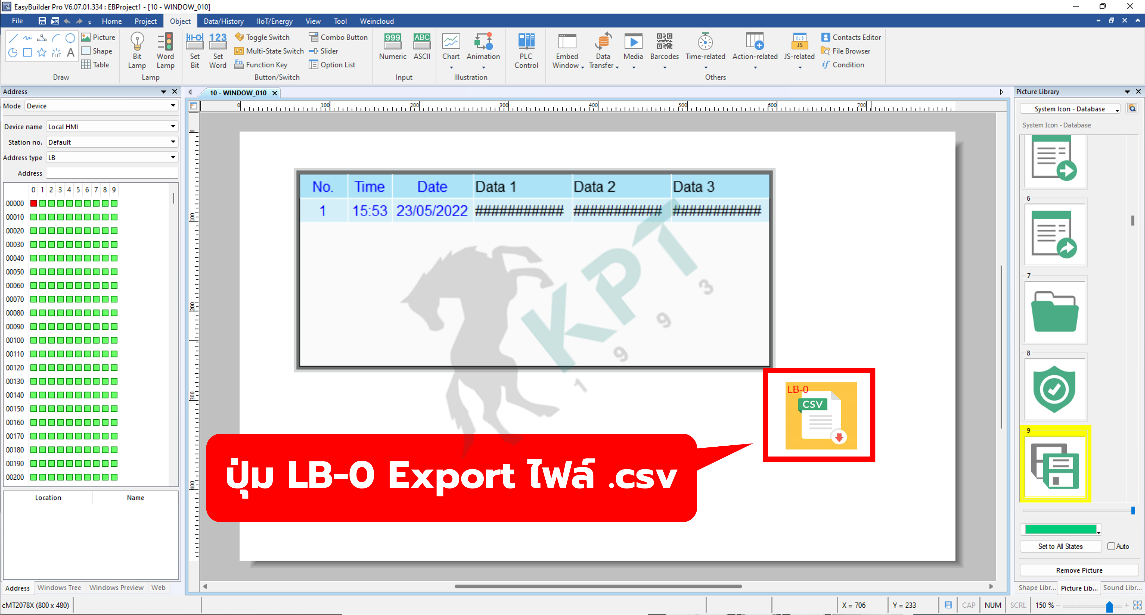 7. เชื่อมต่อ USB Flash Drive เข้ากับจอ HMI Weintek -> กดปุ่ม Export .csv (LB-0)