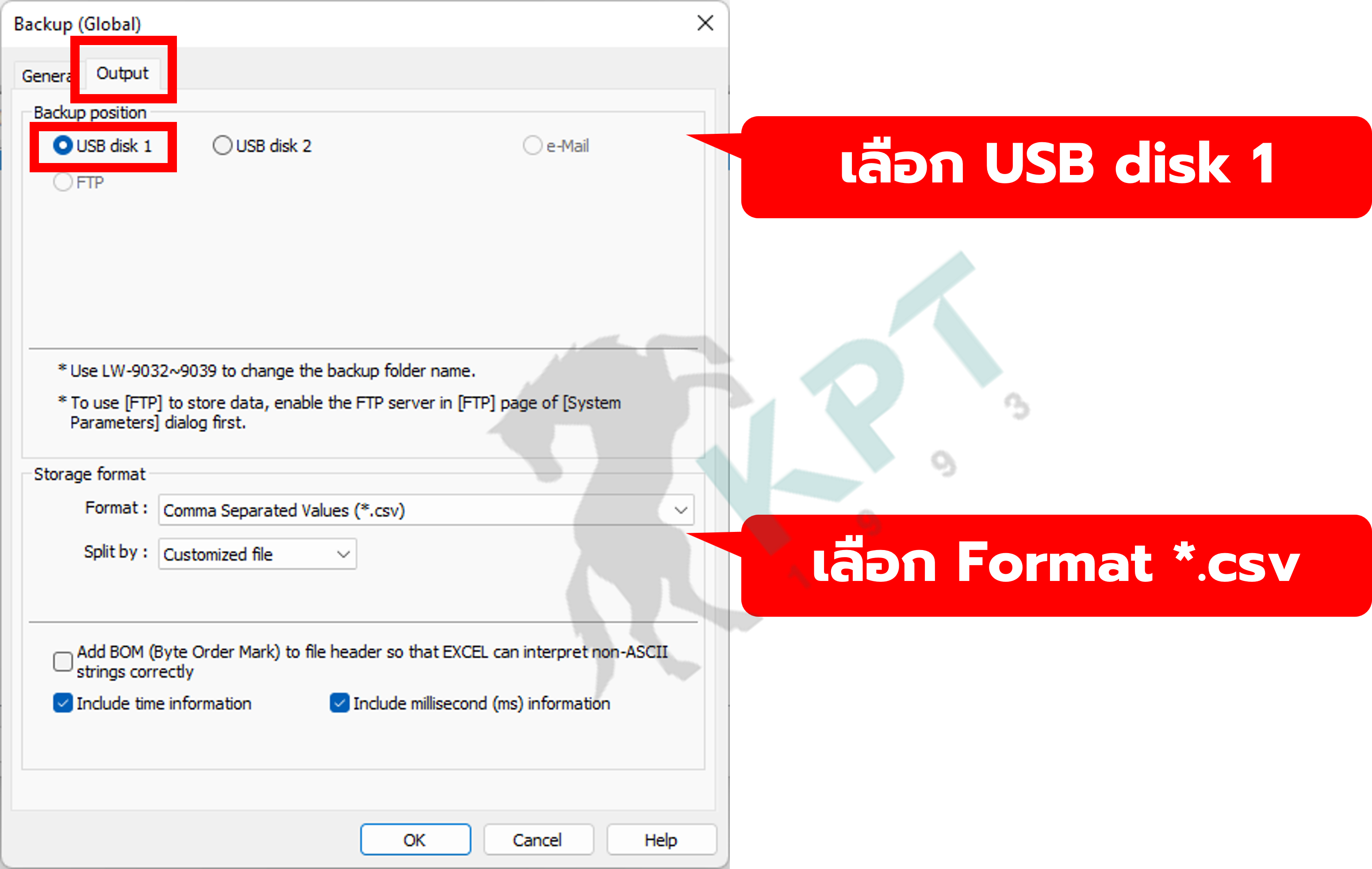 5. แถบ Output -> เลือก USB disk 1 -> เลือก Format *.csv -> กดปุ่ม OK
